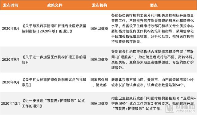 2020年,以国家卫健委为主导的职能部门在一年内的时间里共出台了4项关于护理相关的政策,明确要求卫生健康管理部门和医疗机构加大护理工作力度,规范有序开展“互联网+护理服务”试点工作。